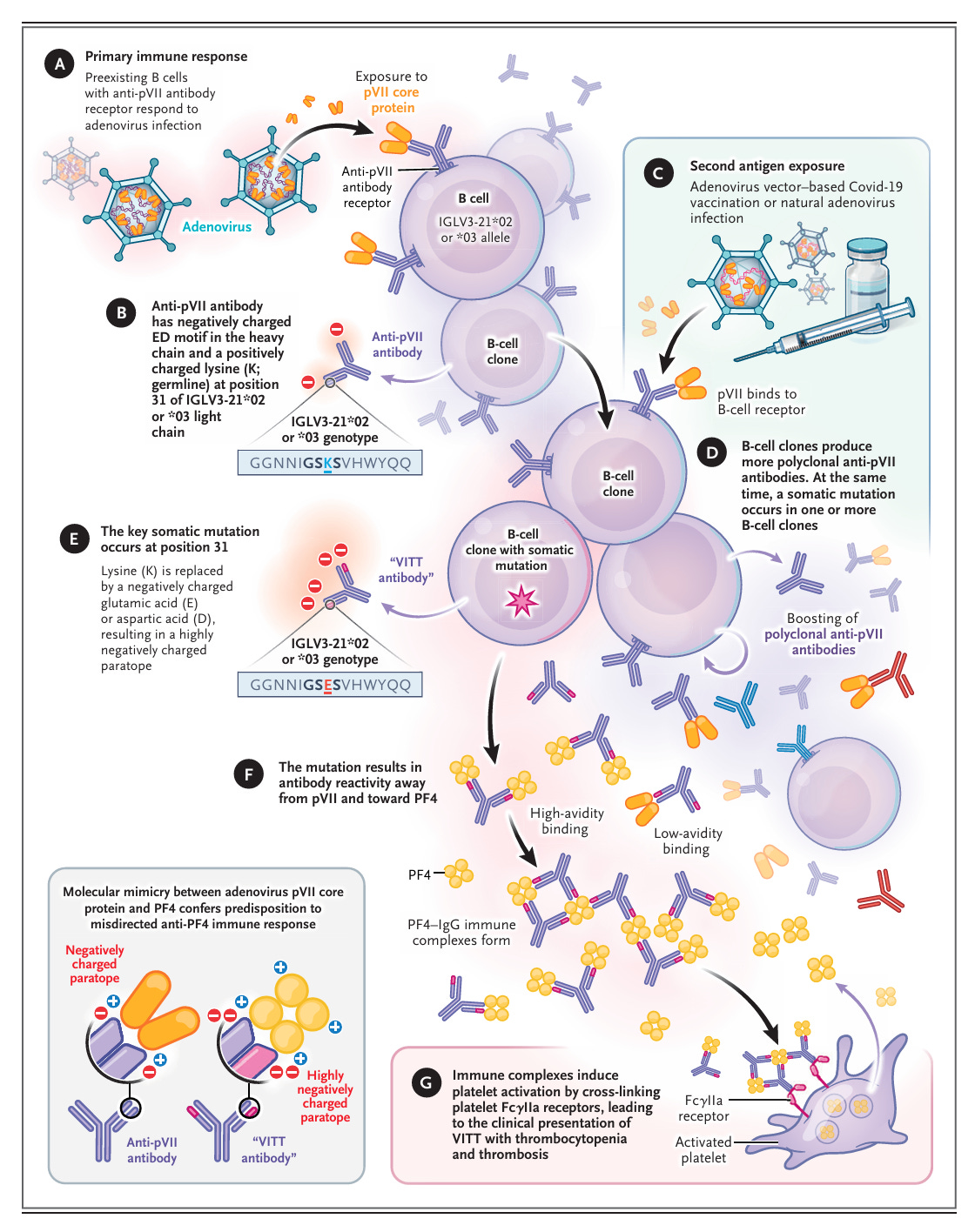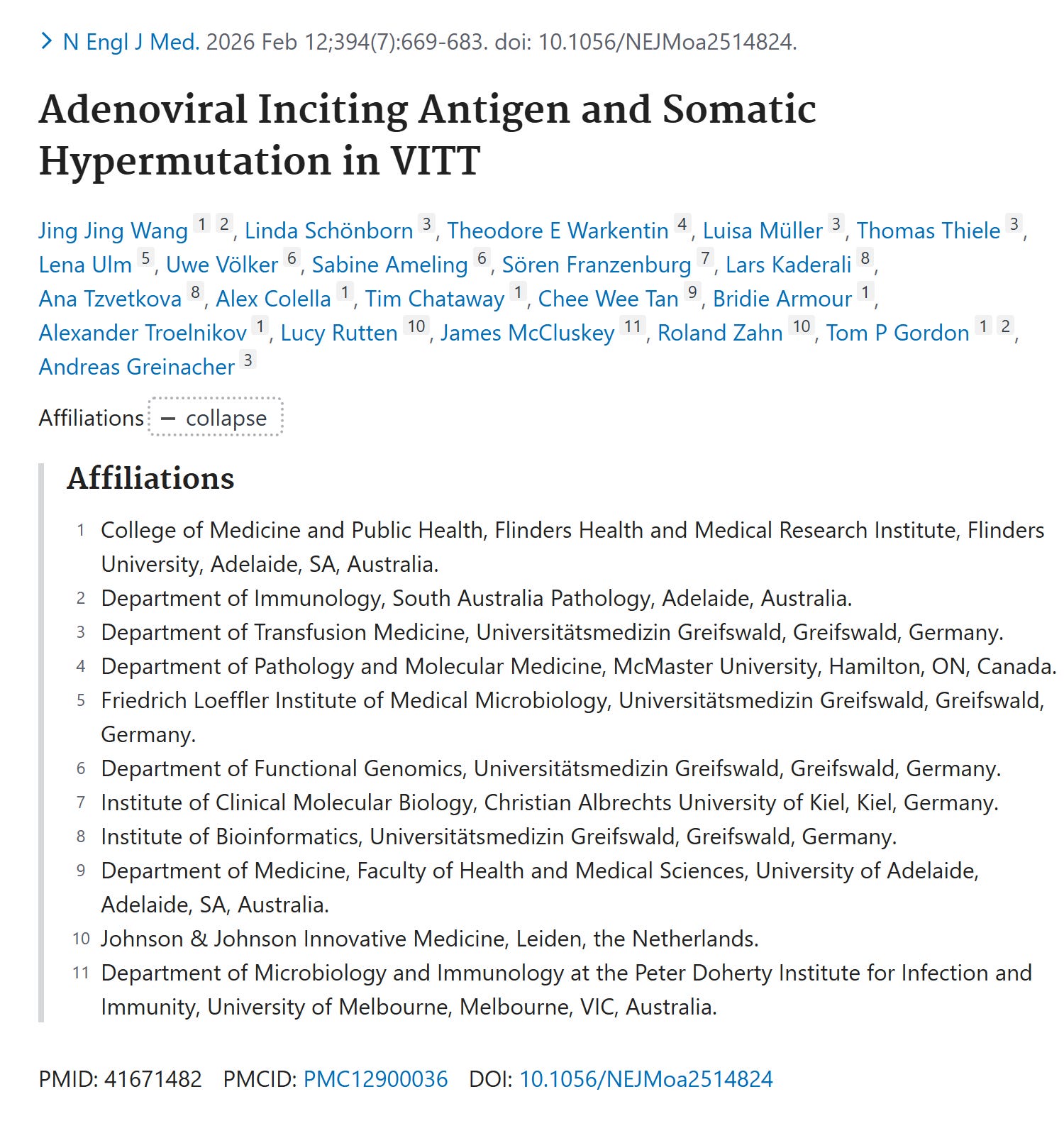 Wang JJ, Schönborn L, Warkentin TE, Müller L, Thiele T, Ulm L, Völker U, Ameling S, Franzenburg S, Kaderali L, Tzvetkova A, Colella A, Chataway T, Tan CW, Armour B, Troelnikov A, Rutten L, McCluskey J, Zahn R, Gordon TP, Greinacher A. Adenoviral Inciting Antigen and Somatic Hypermutation in VITT. N Engl J Med. 2026 Feb 12;394(7):669-683. doi: 10.1056/NEJMoa2514824. PMID: 41671482; PMCID: PMC12900036. https://pubmed.ncbi.nlm.nih.gov/41671482/