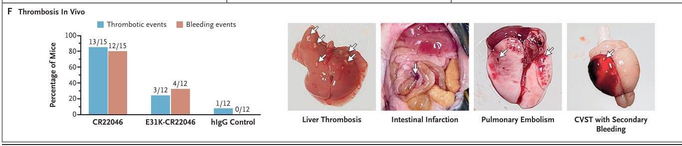 Abbildung F zeigt den Prozentsatz der Mäuse mit makroskopischer Thrombose oder Blutung sowie repräsentative Bilder von Leber, Darm, Lunge und Gehirn. Von den 15 Mäusen, die CR22046 erhielten, hatten 13 (87 %) thrombotische Komplikationen (8 Mäuse hatten Thrombosen an mehreren Stellen). Die sekundäre Hirnblutung wurde durch eine Thrombose der Hirnvenen verursacht. Von den 12 Mäusen, die die zurückmutierte Variante E31K-CR22046 erhielten, hatten nur 3 thrombotische Komplikationen (1 Maus hatte multiple Thrombosen in der Leber und den Hirnvenen, 2 hatten eine Lungenembolie). CVST steht für Thrombose der Hirnvenen.