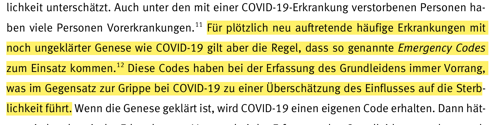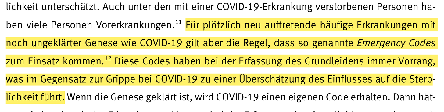 “Für plötzlich neu auftretende häufige Erkrankungen mit noch ungeklärter Genese wie COVID-19 gilt aber die Regel, dass so genannte Emergency Codes zum Einsatz kom men. Diese Codes haben bei der Erfassung des Grundleidens immer Vorrang, was im Gegensatz zur Grippe bei COVID-19 zu einer Überschätzung des Einflusses auf die Sterblichkeit führt.“