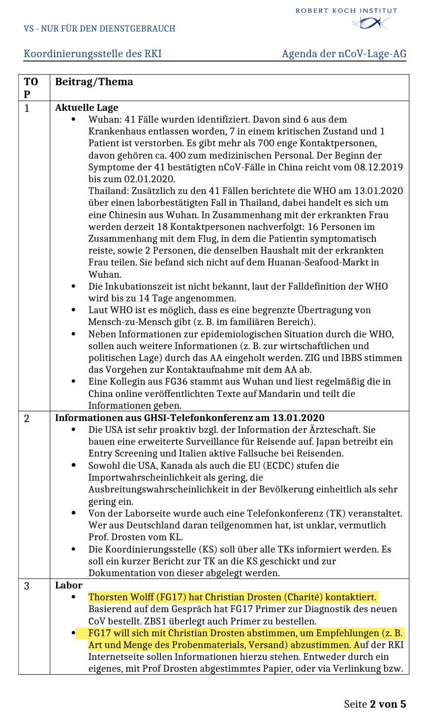 Das erste RKI-Protokoll ist vom 14.01.2020, man findet es im Zusatzmaterial. Bereits zu diesem Zeitpunkt war Dr. Drosten vom RKI kontaktiert worden zwecks PCR Test und Primer.
