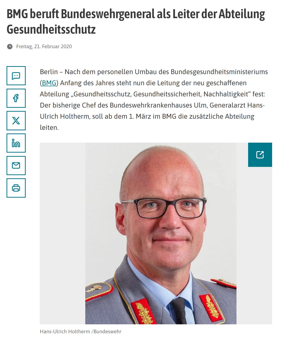 BMG beruft Bundeswehrgeneral als Leiter der Abteilung Gesundheitsschutz – News – Deutsches Ärzteblatt https://www.aerzteblatt.de/news/bmg-beruft-bundeswehrgeneral-als-leiter-der-abteilung-gesundheitsschutz-2e507a1c-0284-4435-8406-18dfbdeabbfb